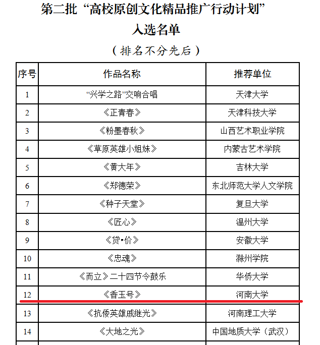 近日,教育部思想政治工作司下发《关于公布第一批、第二批“高校原创文化精品推广行动计划”入选名单的通知》(教思政司函〔2019〕6号)文件,我校原创大型民族音乐剧《香玉号》入选第二批“高校原创文化精品推广行动计划”名单。同期公布的两批行动计划高校共有40所。