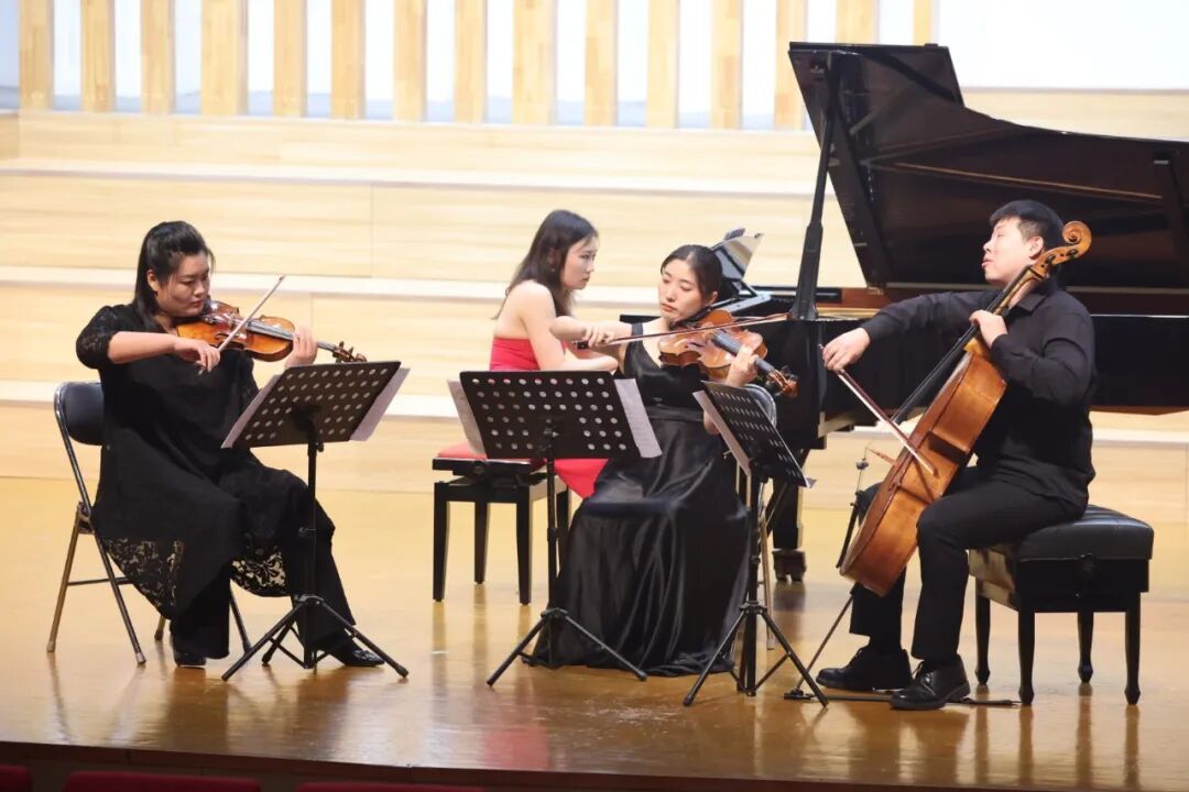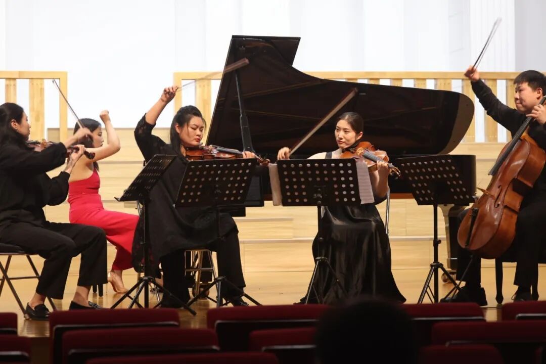 音乐会的压轴曲目是德沃夏克的《A大调钢琴五重奏》(OP.81)。这部作品充满捷克民族音乐元素,旋律优美、节奏生动。钢琴家石文婷与“余音四重奏”的演奏家们默契协作,充分展现了作品中明朗的抒情性与舞蹈般的律动感。钢琴与弦乐声部层次清晰、交相辉映,既有磅礴的气势又不失细腻的情感表达,宛如一幅绚烂的波西米亚风情画卷在观众面前徐徐展开,为整场音乐会画上圆满句号。