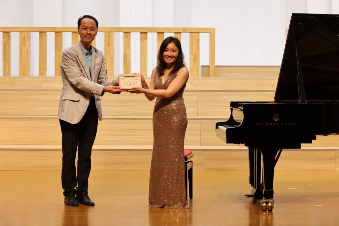 音乐会的尾声举行了荣誉授予仪式。受河南省音乐家协会驻会副主席李新现教授委托,河南省音乐家协会钢琴专业委员会主任陈放教授代表河南省音乐家协会钢琴专业委员会,向石文婷颁发“艺术发展交流大使”荣誉证书,表彰她作为河南籍钢琴演奏家在推动钢琴艺术交流与事业发展中所作的杰出贡献。