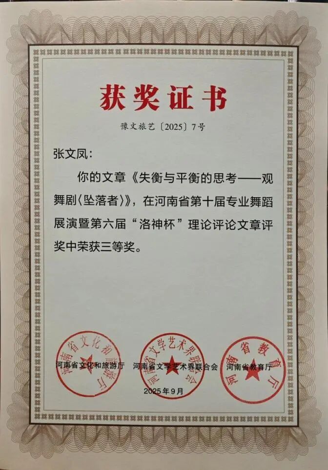 三等奖3项:《失衡与平衡的思考——观舞剧〈坠落者〉》《当代视角下的中国古典舞创新——从〈门神〉谈起》《探究新媒体对舞蹈艺术发展的促进作用——以〈舞千年〉为例》。