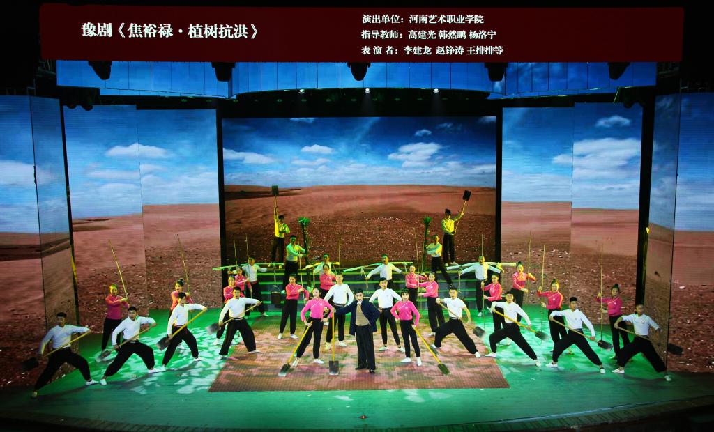 京歌表演《中国戏曲》率先拉开了第一乐章帷幕,水袖轻舞,跟头翻动,展示唱念做打的魅力。豫剧《大登殿》、二夹弦《万紫千红绘汴梁》等选段,演绎了传统戏曲之美。第二乐章“经典传承”紧随其后,经典剧目联唱博得满堂彩。老戏翻新,《朝阳沟》《收姜维》《包青天》等戏曲经典唱段的熟悉旋律,引起在场观众的强烈共鸣。第三乐章“古韵新声”是戏曲进校园的着重展示部分,《俏花旦》等剧目通过传统文化与现代社会生活相结合的方式,谱写了青少年担当弘扬戏曲文化的新篇章。豫剧《焦裕禄•植树抗洪》再现了人民的好书记——焦裕禄一心为民的铮铮铁骨。最后,一曲豫歌表演《沁园春•雪》将晚会的气氛推向了高潮。