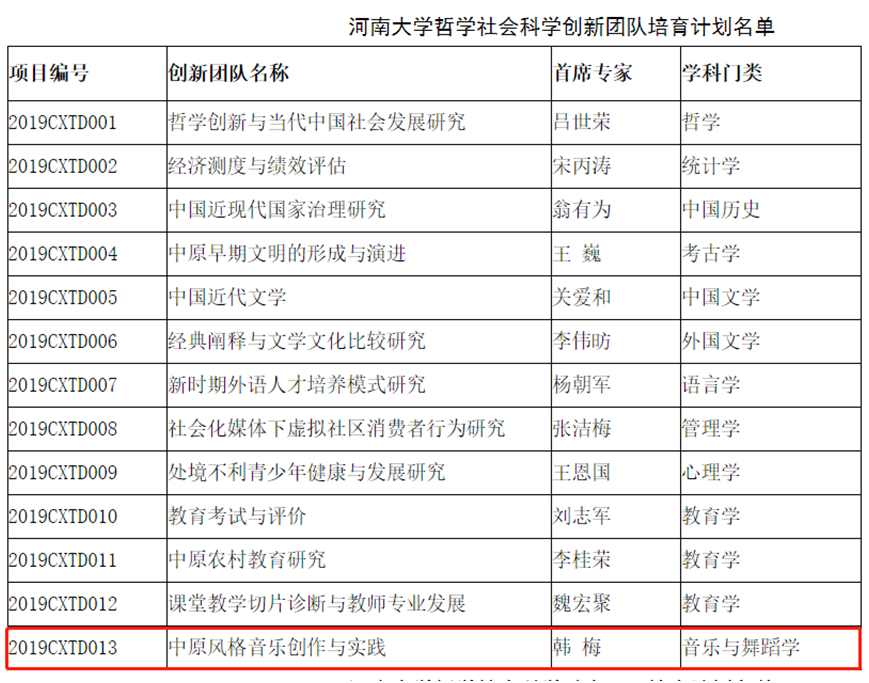 韩梅教授领衔的“中原风格音乐创作与实践”课题组获批“河南大学哲学社会科学创新团队”。陈文革教授主持的“二十世纪以来中原戏曲的嬗变与发展研究”,陈宗花教授主持的“中国共产党音乐传统继承与新时代音乐的创新”获批“河南大学哲学社会科学重大项目培育计划”。这是K7娱乐