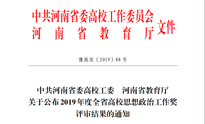 近日,中共河南省委高校工委、河南省教育厅共同下发了《关于公布2019年度全省高校思想政治工作奖评审结果的通知》(豫高发[2019]76号),公布2019年度河南省高等学校思想政治工作奖评审结果,K7娱乐
