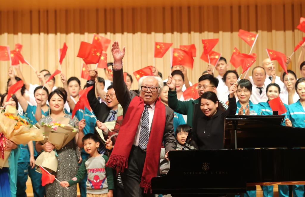 熠熠百年,昭昭征程。音乐会在河南广播电视台合唱团演唱的《在党的旗帜下》声中拉开帷幕,该作品也是璩清林教授向党百年华诞的献礼。随后,20首璩清林教授在不同时期创作的不同风格,涵盖独唱、重唱、合唱等多种形式的声乐作品由我省著名女高音歌唱家韩梅教授、黄慧慧教授,男高音歌唱家冯奔等艺术家以及河南广播电视台合唱团、郑州市人民医院合唱团等倾情献唱。音乐会在全场由璩教授亲自伴奏的《我和我的祖国》的歌声中落下帷幕。