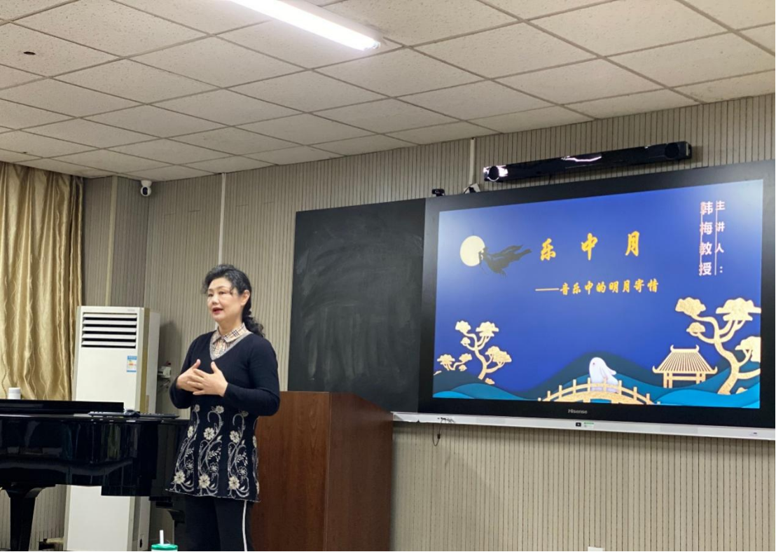 韩梅教授以“乐中月——音乐中的明月寄情”为题,采用理论与实践相结合的形式,多角度、多层次的阐释音乐中“月亮”的意象,带领同学们沉浸式的感受传统音乐的独特魅力。