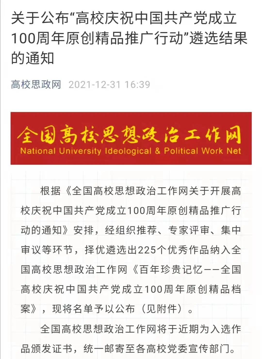 12月31日,教育部全国高校思想政治工作网发布《关于公布“高校庆祝中国共产党成立100周年原创精品推广行动”遴选结果的通知》,K7娱乐