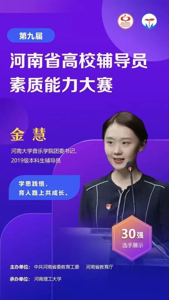 时光荏苒,金慧老师已在辅导员岗位上工作近六年,始终奋战在学生工作一线,带领学生多次获得国家级、省级和校级集体荣誉,个人也多次在省级、校级各项比赛中获得一等奖,2021年被评为河南大学优秀共产党员、优秀辅导员。对于辅导员工作和比赛,金慧老师这样说到:辅导员素质能力大赛是对平时工作是否深入学生一线的检查,对理论知识与实践经验的凝练,也是对辅导员工作定力的考验。很荣幸能够参与比赛,这是对自己辅导员职业生涯的极大肯定;也很庆幸能够参加比赛,在这场高水平赛事中向前辈学习、向榜样学习,促思考、提能力、明方向、强定力。在未来的日子里,将扬优势、补短板,继续扎根学生工作一线,以潜心育人的不变初心,更好担当培育时代新人的工作使命,切实成为学生传道授业解惑的“经师”和“人师”的统一者。