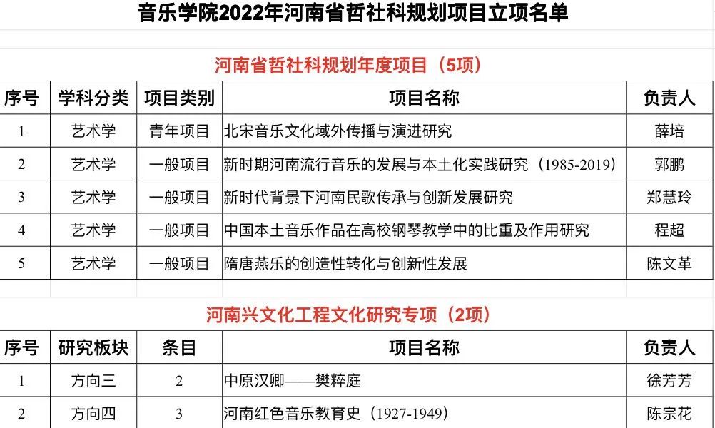 教师薛培、郭鹏、郑慧玲、程超、陈文革申报的项目获批2022年河南省哲学社会科学规划年度项目;徐芳芳、陈宗花申报的项目获批2022年河南兴文化工程文化研究专项项目。