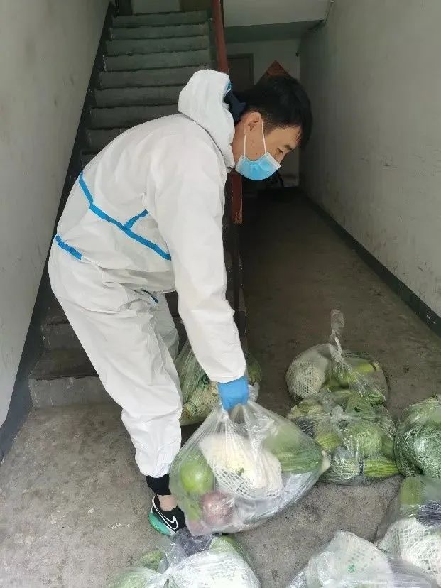 张志鹏老师是22号家属院的志愿者,周一飞老师和赵瑞新老师是21号家属院的志愿者。在疫情最紧张的时期,他们身穿白色防护服,将每一包沉甸甸的蔬菜,送到小区的家家户户。平平常常的蔬菜,此时此刻,饱含着来自学校的关爱和温暖和志愿者们辛苦的付出!
