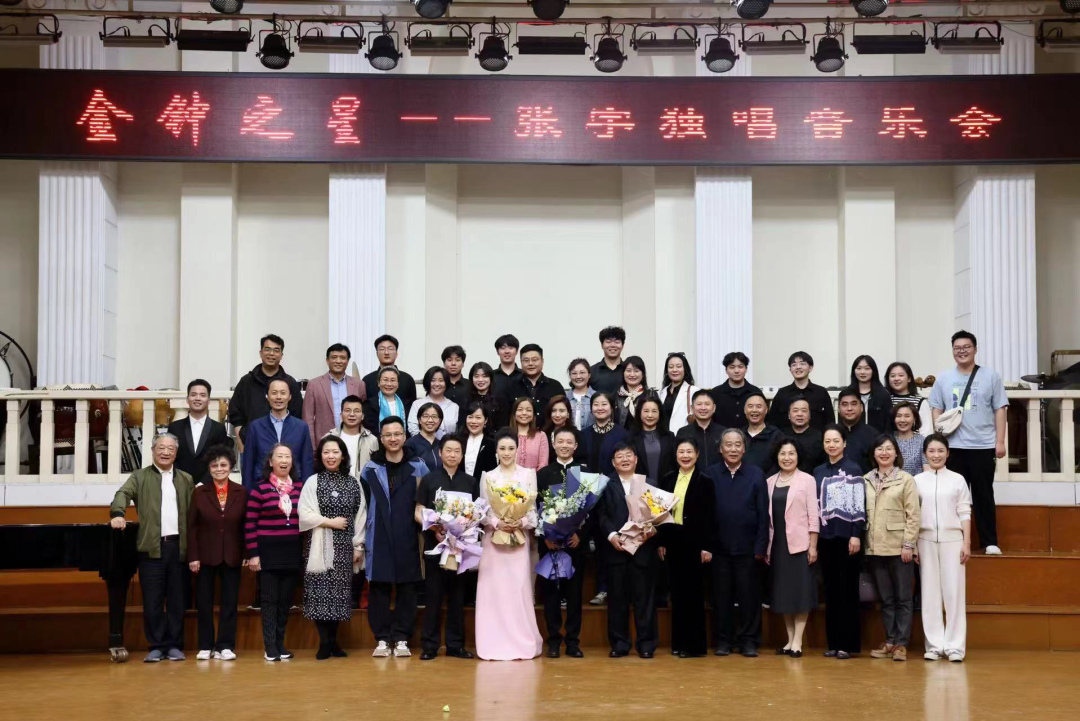 音乐厅隆重举行。本场音乐会的演唱曲目涵盖了中国艺术歌曲、中国古诗词艺术歌曲、地方民歌、创作歌曲等。张宇老师的演唱声线优美、张弛有度、真挚感人,将“唱”与“演”充分融合,带给观众们耳目一新的视听感受。谭学胜教授和赵振岭教授作为特邀嘉宾,分别演唱了《鹰翔》《天路》《船工号子》《再见吧,大别山》等歌曲,将音乐会推向高潮。音乐会在三位歌唱家共同演唱的《我和我的祖国》歌曲中完美落幕。