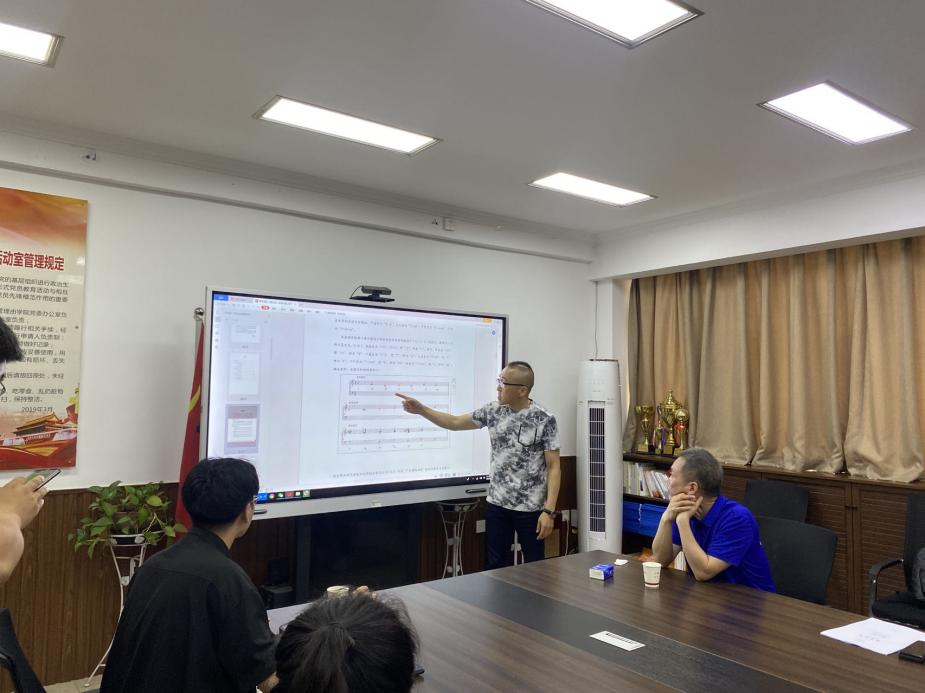 在读研究生的音乐作品进行指导。针对2021级作曲方向研究生张轩卿同学提交的原创作品钢琴组曲《落日随想》,徐教授从该作品的乐思来源、音乐结构布局、音列构成、听觉、速度等方面提出了修改建议,对学生的音乐创作给予了良好启发。徐教授还结合自己创作的交响序曲《亚洲之光》,从风格、结构、特色等方面,向与会师生介绍了自己的创作构想、实现方式和作曲技法。