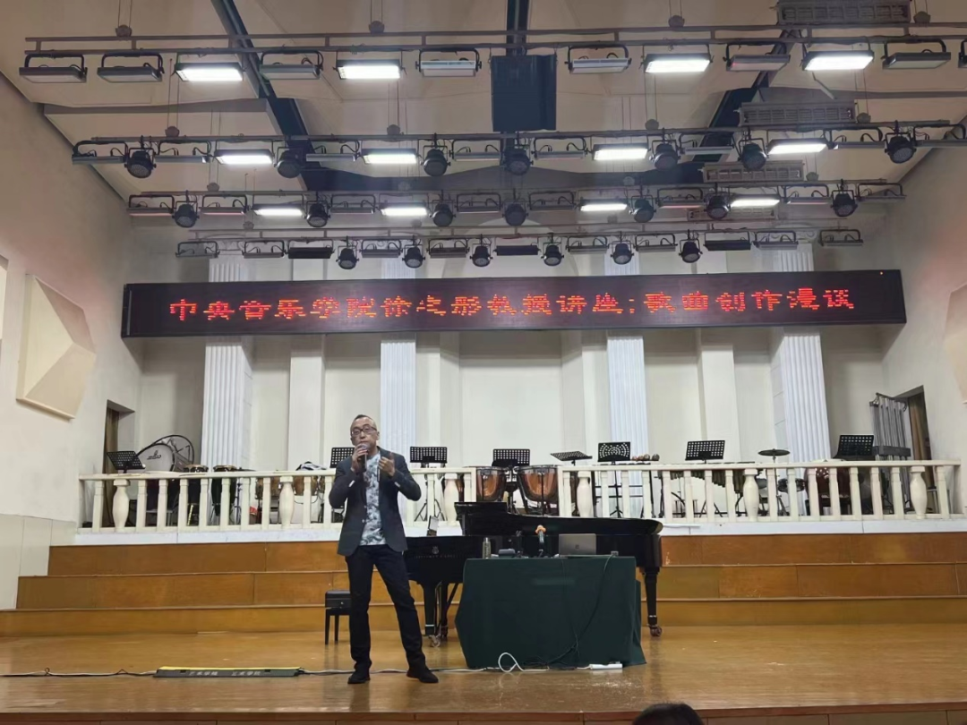 讲座由四个部分组成。在第一部分“如何写好中文歌”中,徐之彤教授凭借自己的创作经验,与大家分析了中文歌曲的创作难点和优秀歌词的典型特征。讲座的第二部分,徐教授以自己创作的影视音乐作品为例,从音乐动机、结构设计、音区音色选择、伴奏乐器配置等方面对其作品进行了详细解读,生动讲解了每部影视音乐的诞生过程。在讲座的第三部分,徐教授以三毛的诗《远方》、俄罗斯作曲家穆索尔斯基的歌曲《小星星,你在哪里》为例,向大家解读了歌曲创作时应该强调的重点词语和旋律处理方式,并对创作歌曲旋律的技法进行了细致讲解。