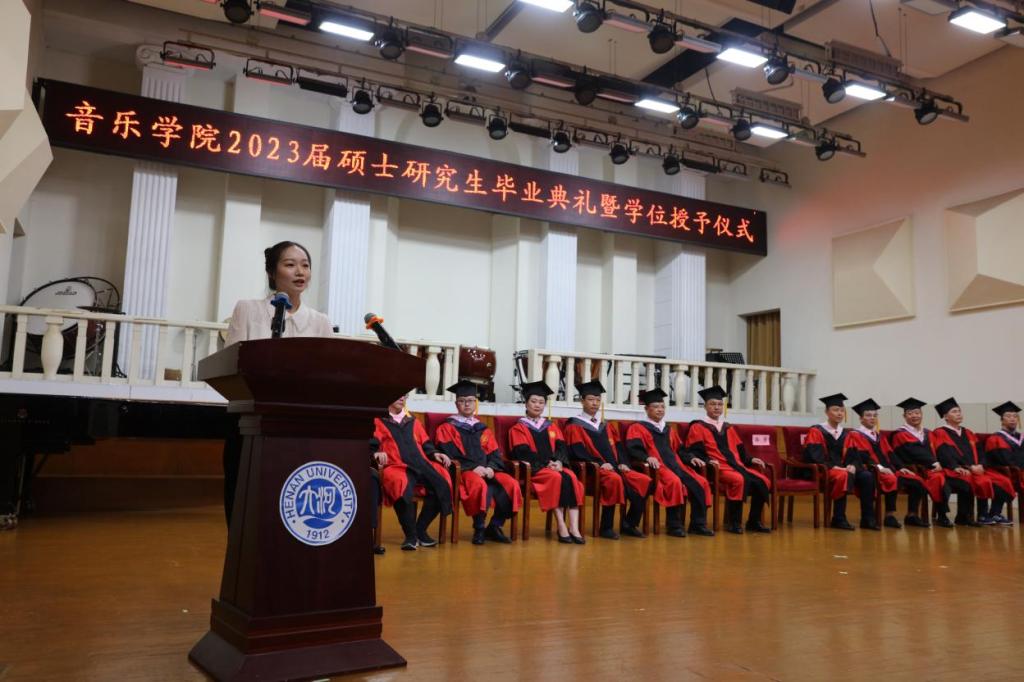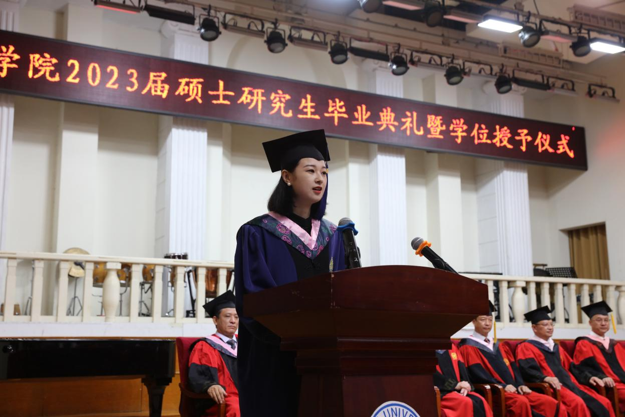 鲜衣怒马少年时,不负韶华行且知。毕业生代表、2023届硕士研究生王雨茜代表全体毕业生向辛勤培育学子的领导和老师们表示最诚挚的谢意,并表示身为“铁塔牌学子”,无论身处何时何地,都会做追求“立德,修身,乐艺,践行”的实践者,做“唱响青春之歌”的梦想者,在践行中国梦的征途中实现梦想,用青春的智慧和汗水书写人生答卷。