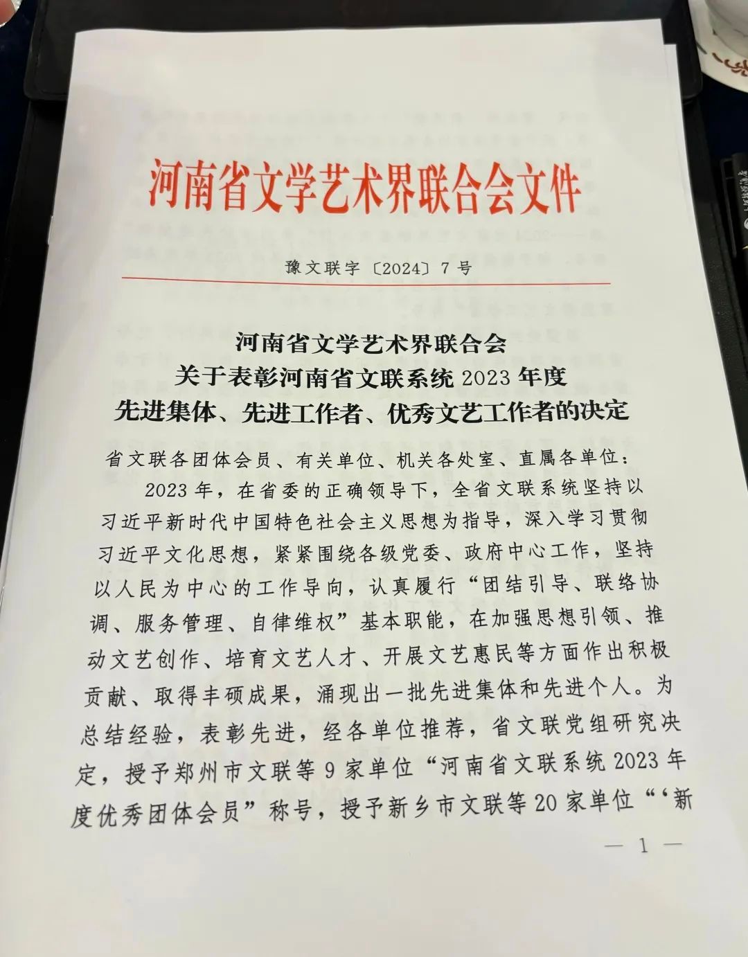 2024年2月29日,在河南省文学文艺界联合会关于表彰河南省文联系统2023年度先进集体、先进工作者、优秀文艺工作者的决定中,河南 大学K7娱乐