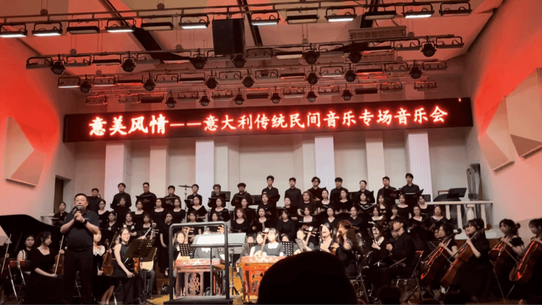 管弦乐团、合唱团参与表演,Dell' Atti教授担任整场音乐会的指挥。这场别开生面的音乐会呈现出中意音乐文化的交融。在乐队配置方面,创新地采用西洋管弦乐队与中国民乐相结合的配器形式,以中阮代替琉特琴,二胡代替双簧管;在演唱方面,将意大利传统民歌Bellacidormi用中文重新填词演唱,Dell' Atti教授还用中国的筷子代替指挥棒,完成了整场音乐会的指挥。音乐会好评如潮,掌声雷动,久久不息。