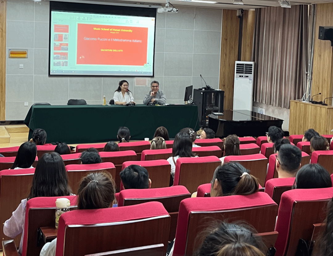 声歌系副主任虎翼主持,青年教师王杨担任翻译。本次活动恰逢意大利歌剧作曲家普契尼逝世一百周年,Dell' Atti教授围绕“爱的咏叹者”这一关键词,讲述了普契尼的歌剧生涯。他以《西部女郎》《蝴蝶夫人》等多部歌剧代表作为例,通过聆听经典的咏叹调,探寻普契尼歌剧中表层音乐风格与深层人性情感之间的纽带。其中,着重强调了歌剧《图兰朵》中以中国民歌《茉莉花》为基础改编的旋律音调,进一步呈现中意音乐文化之间的碰撞。最后,Dell' Atti教授与在场师生针对意大利真实主义歌剧、瓦格纳乐剧以及中国传统戏曲展开讨论,思考中外戏剧的相似性,体现了“互学互鉴,开放包容”的活动主旨。