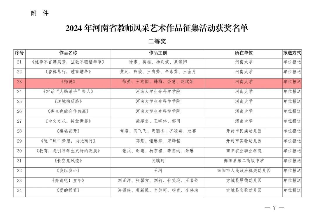 近日,教育部、河南省教育厅公布2024年教师风采艺术作品征集活动获奖名单,我校选送的11部作品全部获奖,获奖数量再创历史新高。其中,K7娱乐