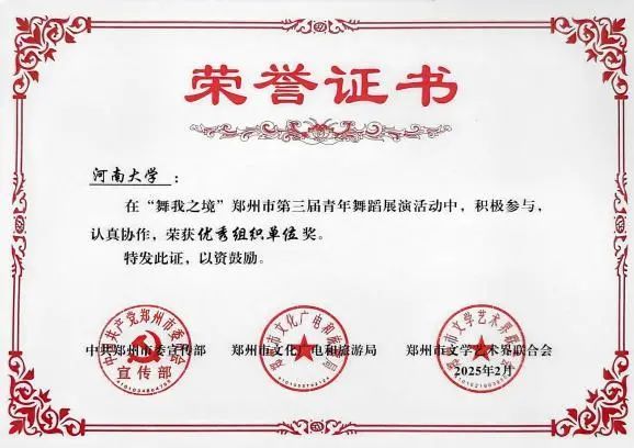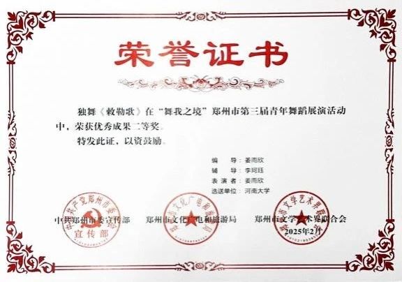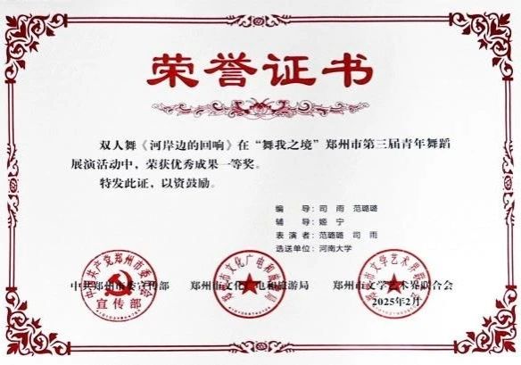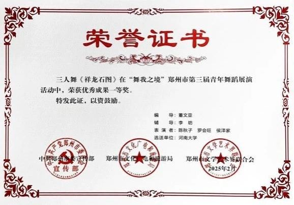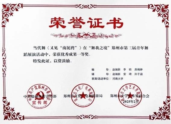 团委副书记,青年教师赵瑞新带队,与来自郑州地区专业院团、大中专院校以及社会新文艺群体同台竞技,近日比赛结果公布,舞蹈系在121个报送的舞蹈作品有5个作品获奖,其中一等奖3个:双人舞《河岸边的回响》、三人舞《祥龙石图》、群舞《又见“南泥湾”》。二等奖2个:独舞《敕勒歌》、群舞《滚灯闹元夕》,成为所有参赛单位中获奖数量最多的选送单位,并因此获得了“优秀组织奖”。