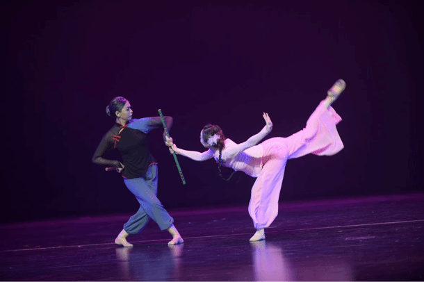 女子双人舞《河岸边的回响》,取材于河南非遗舞蹈霸王鞭为核心元素,塑造出一老一少的人物形象,通过老人与青年人间的传承交流,呼吁人们关注并保护非遗文化,让非遗文化在时代的洪流中焕发新的活力。