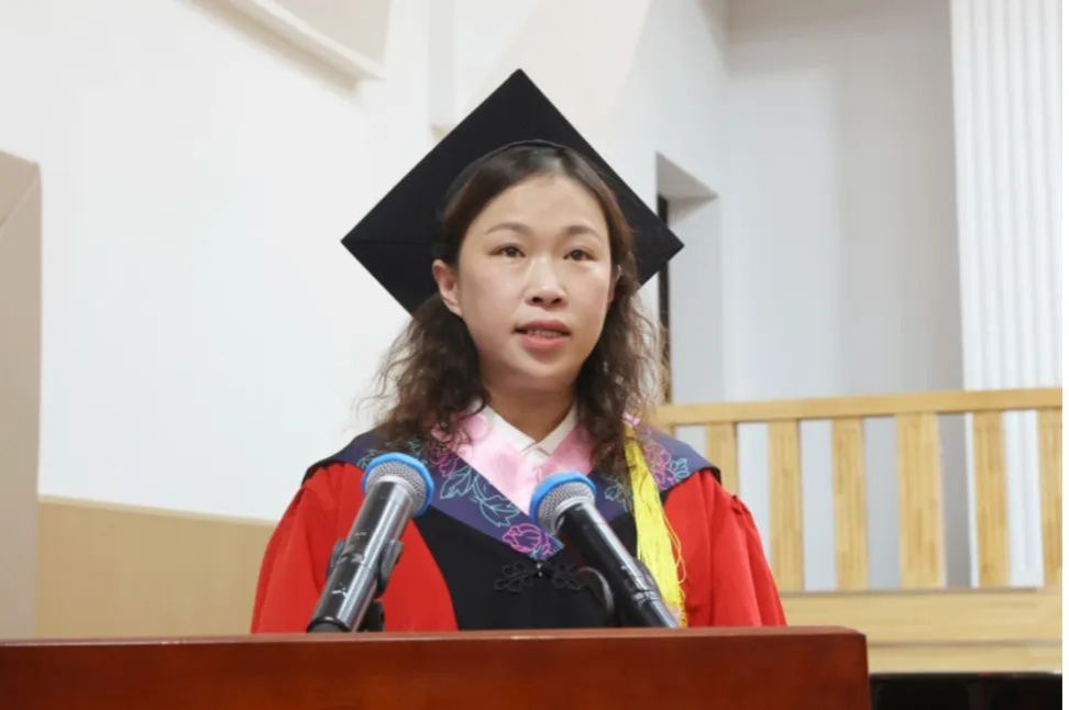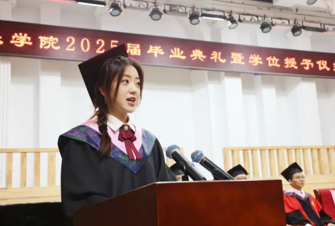 毕业生代表黑铄荃上台发言,她回顾了自己在学院的成长历程,表达了对学院培养和老师教诲的感激之情,并鼓励同学们勇敢追梦,不忘初心。
