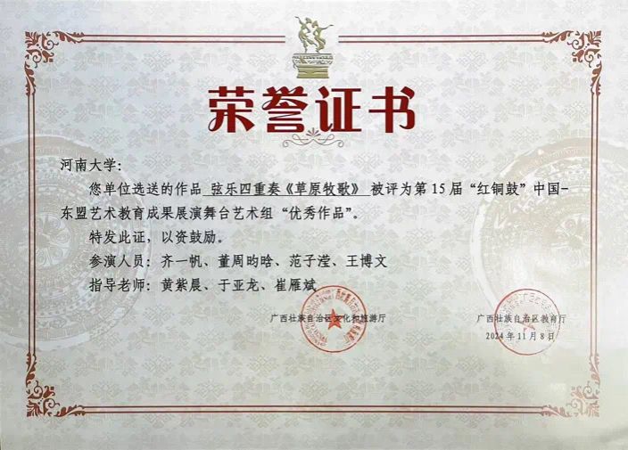 弦乐四重奏《草原牧歌》也以其独特的艺术风格和精湛的表演技巧赢得了评委们的青睐,被评为“优秀作品”(二等奖)。《草原牧歌》是一首具有民族特色的音乐作品,更是一部展现草原风情和民族文化的艺术佳作。它通过音乐的形式,将草原的辽阔与壮美、牧民的生活与情感生动地呈现在听众面前,促进了不同民族之间的文化交流与融合,推动民族文化的传承与发展。