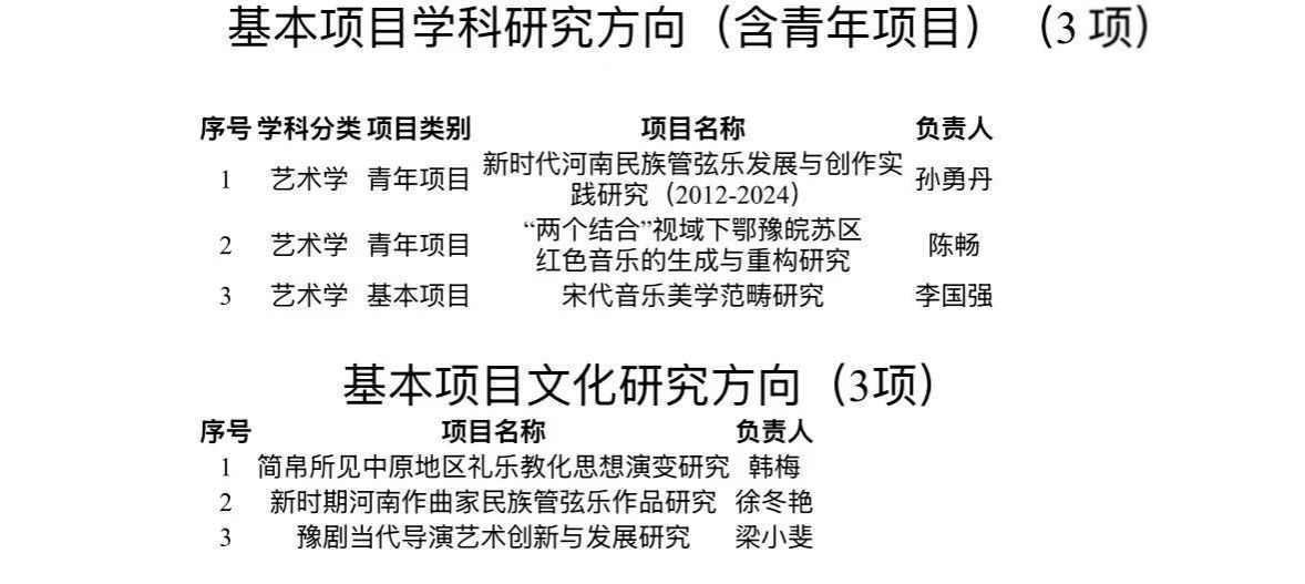 近日,河南省哲学社会科学规划项目、中华民族音乐传承出版工程精品出版项目、国家艺术基金资助项目等科研与艺术创作项目相继发布了立项名单,K7娱乐 多位教师申报的项目获批立项。