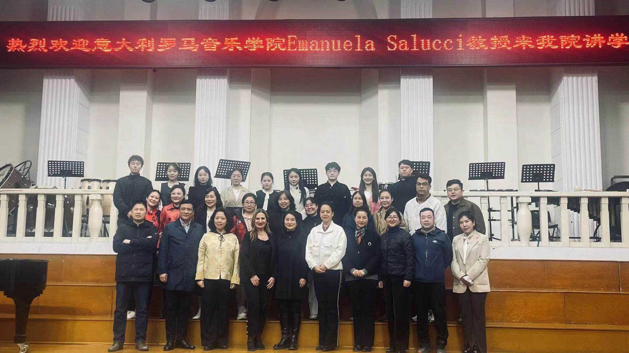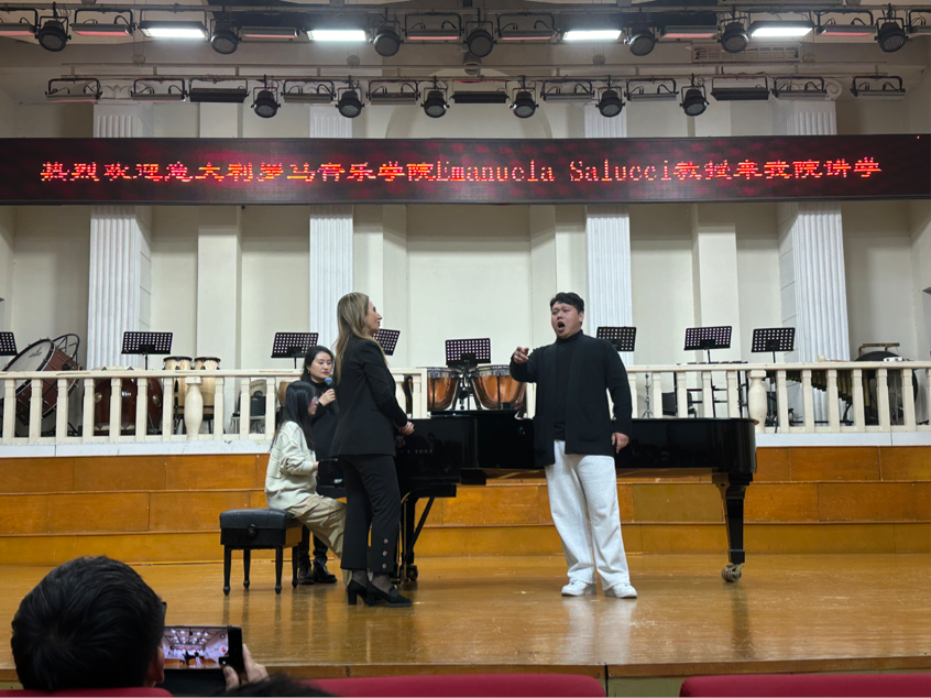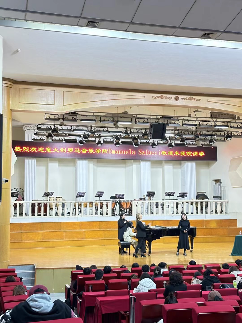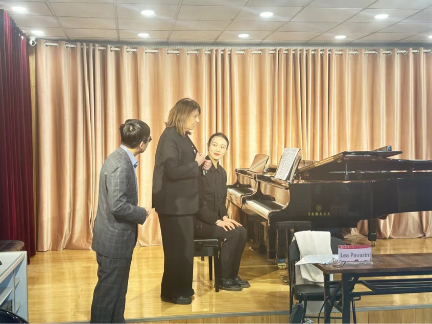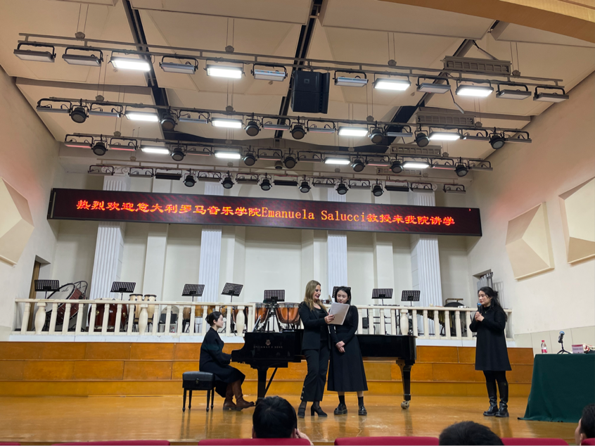 Emanuela Salucci教授和Lea Pavarini教授分别在音乐厅和钢琴教研室举行了讲座公开课,学术交流活动分别由声歌系主任黄慧慧、钢琴系主任潘伟主持。