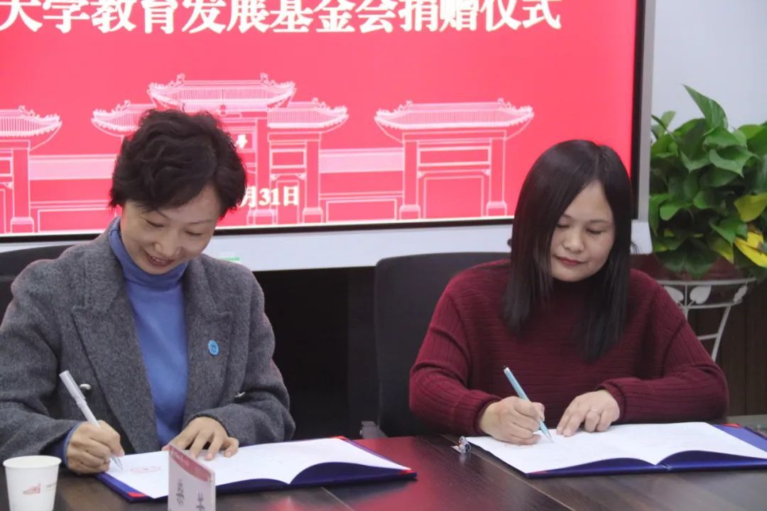 星月琴行有限责任公司总经理王景玲与河南大学教育发展基金会秘书长刘婷签订捐赠协议