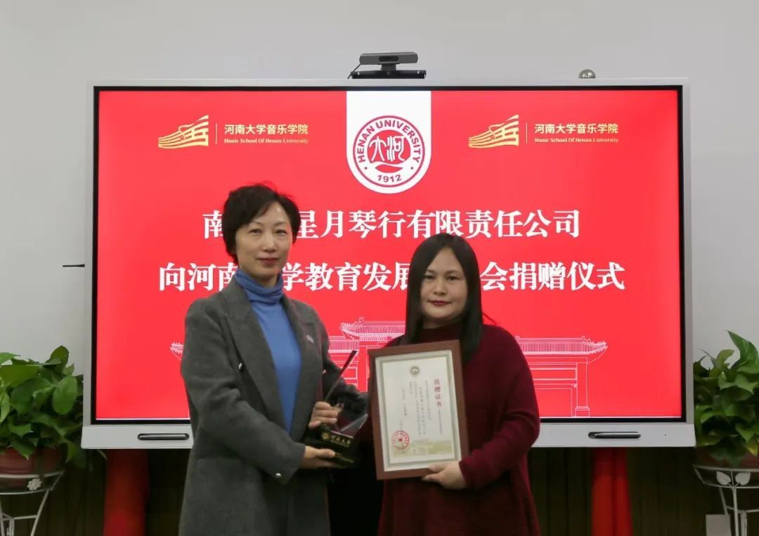 河南大学教育发展基金会秘书长刘婷向捐赠方星月琴行有限责任公司王景玲颁发捐赠证书和纪念杯