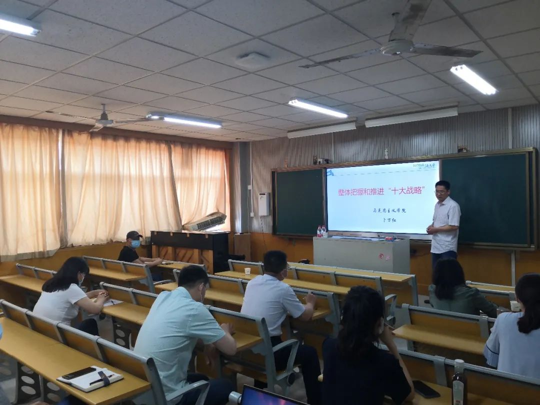 会议邀请马克思主义学院副教授、硕士生导师卜万红作了题为《整体把握和推进“十大战略”》的报告。卜万红老师对我省第十一次党代会的主题进行了详细解读,并对“十大战略”进行了深入分析,表示十大战略和我省 “谋振兴、促崛起、求跨越、争出彩”的30年发展主题主线一脉相承,同国家和省委对到本世纪中叶的建设规划遥相呼应,为河南省定下了九个清晰的中期发展目标,为我省补短板、强基础、扬优势指明了方向;从整体布局上看,十大战略有助于稳定传统动力、寻找新动力,既坚持传统优势提升,又着力寻找新增长点,确保高质量建设现代化河南,高水平实现现代化河南。