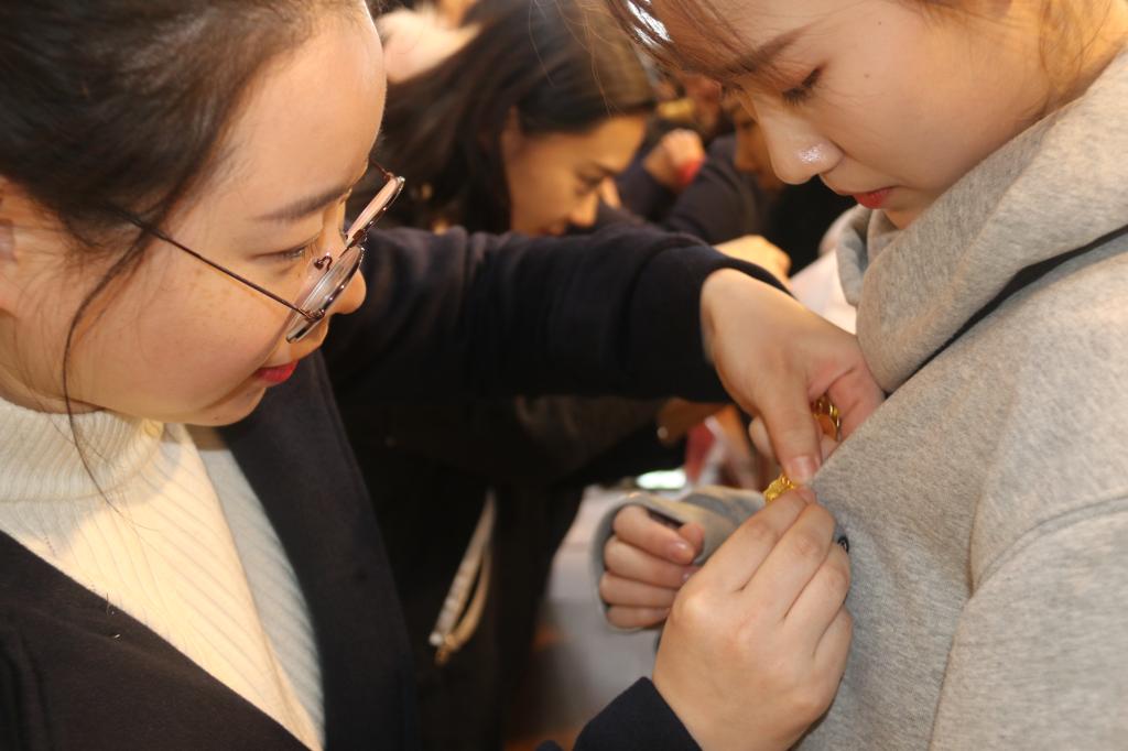 仪式上,老党员为新党员依次佩戴党徽,并向新党员表示祝贺。
