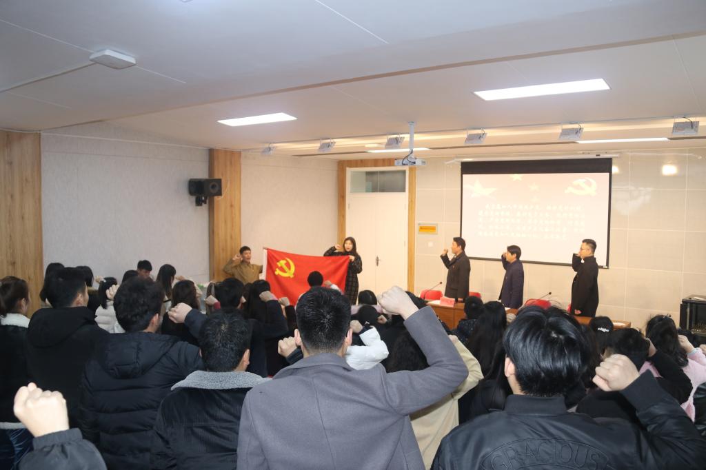 随后,面向党旗,新党员进行了入党宣誓、老党员重温入党誓词。本科2016级学生王佳代表新党员向党组织庄严承诺:将以优秀党员为榜样,向更高水准看齐,在今后的学习和工作中用实际行动实践自己的入党誓言,努力完成各项任务,使自己无愧于中国共产党员这一光荣称号。研究生第二党支部书记、2016级学生刘紫檀代表老党员寄语新党员,要做心怀感恩、政治合格、勤奋务实的优秀党员,互相监督,共同进步,坚定信仰,用实际行动践行誓言。