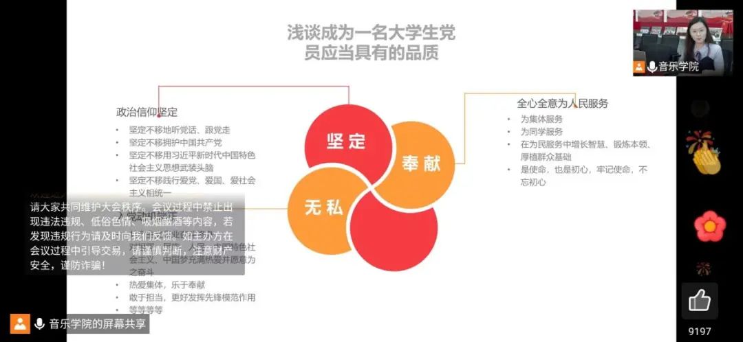 党组织概况、入党流程、入党动机、党员组织生活等内容,希望同学们能够珍惜大学生活,积极融入校园,多尝试、多探索,牢记习近平总书记”用脚步丈量祖国大地,用眼睛发现中国精神,用耳朵倾听人民的呼声,用内心感受时代脉搏“的殷殷期盼,在青春的赛道上跑出最好的成绩。