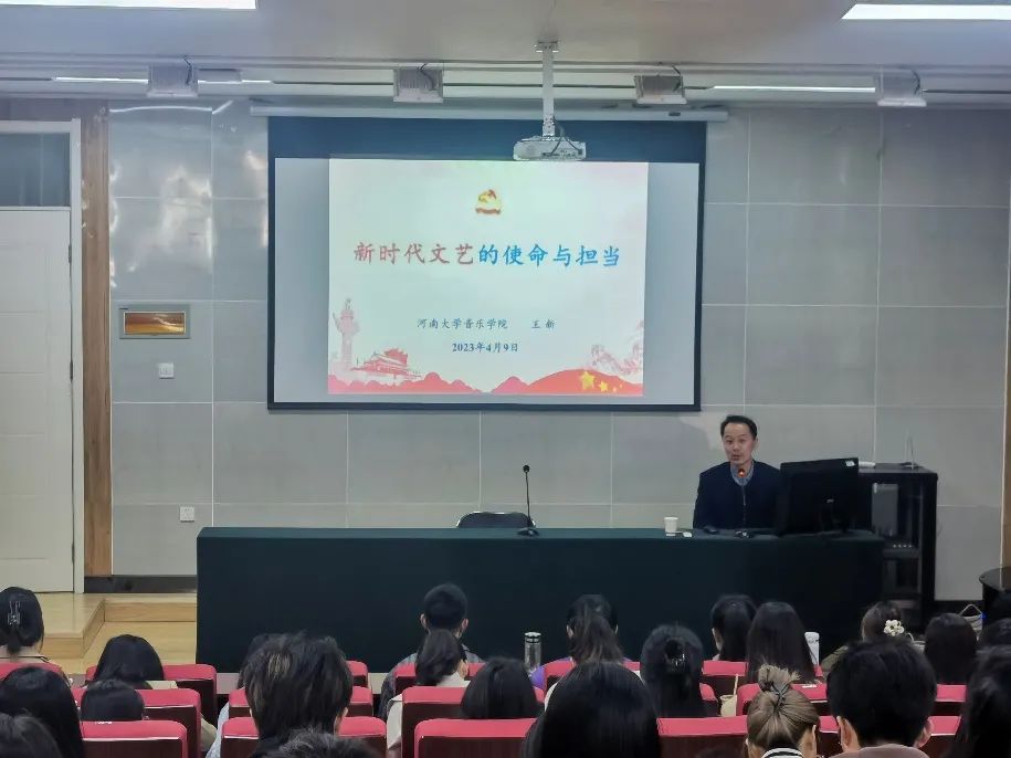 王新以“新时代文艺的使命与担当”为题,为同学们讲述了中国共产党建党以来的文艺政策,重温了各个时期富有时代和民族特色的文艺作品,指出党的文艺政策始终立足人民、服务人民,号召同学们紧紧围绕举旗帜、聚民心、育新人、兴文化、展形象的使命任务,树立高远的理想追求。