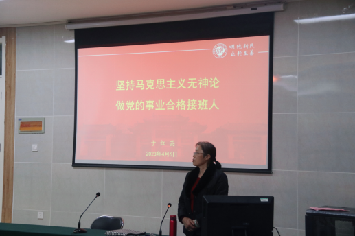 于红英以“坚持马克思主义无神论,作党的事业合格接班人”为题作主题讲座,她表示,共产党人要坚定理想信念,为共产主义事业奋斗终身。新时代的青年要以科学的态度对待世界,对待人生,树立远大理想,做党的事业合格接班人。