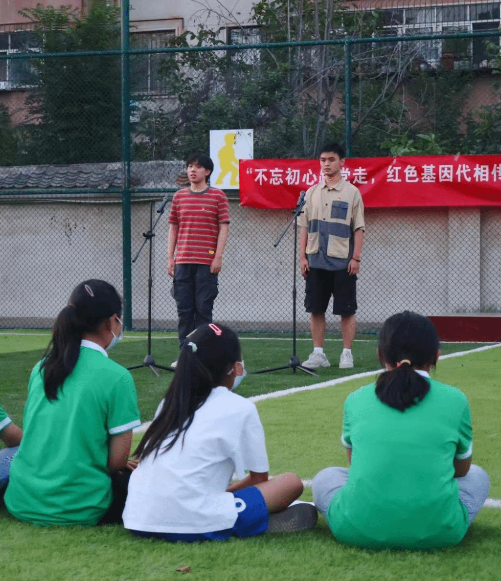儿童村足球场上,本二支部的同志们为儿童村的小朋友们开展了一场精彩的演出,带来了合唱、器乐独奏、合奏等节目,并和孩子们进行了交流,讲述每一首歌背后的红色故事,并向孩子们讲解演奏的乐器。