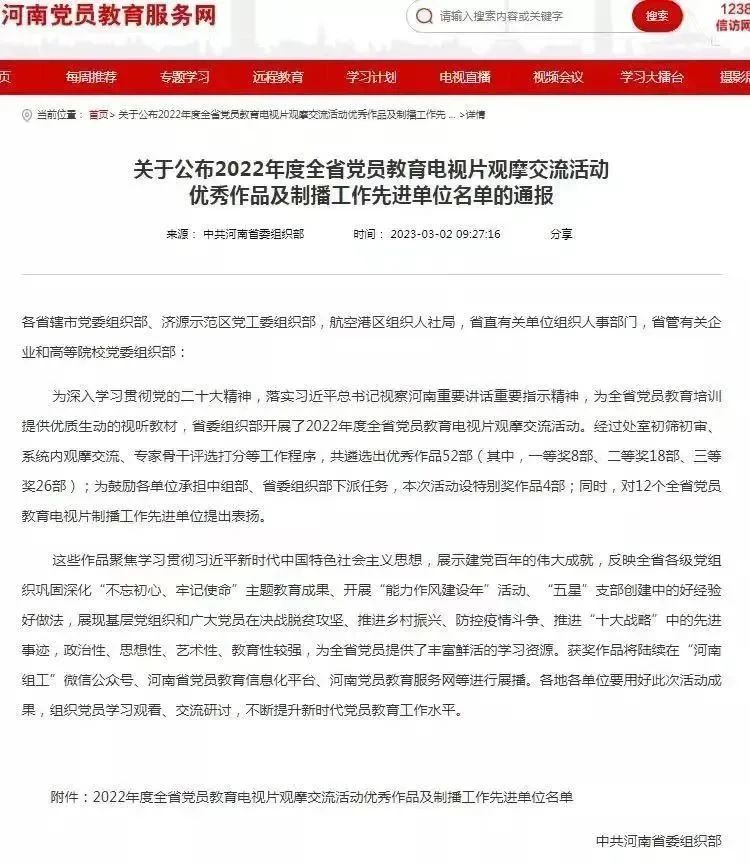 3月,省委组织部发布了《关于公布2022年度全省党员教育电视片观摩交流活动优秀作品及制播工作先进单位名单的通报》,由我校党委组织部、党校遴选报送的K7娱乐