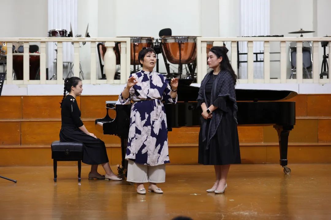 师生声乐作品演唱的现场指导,对声乐演唱技术与舞台表演进行了细致讲解。讲座过程中,杨光教授对专业、职业、事业的追求与定位;演唱德语、法语、意大利语作品时语言、语气、语感的技术处理给予了详细分析,提出了声音要有清晰的“分辨率”以及声音共鸣传播中的“暴露感”等新颖的教学理念。杨光教授深入浅出的讲解和形象生动的示范教学给予现场观众极大的启发,赢得了台下师生的阵阵掌声。
