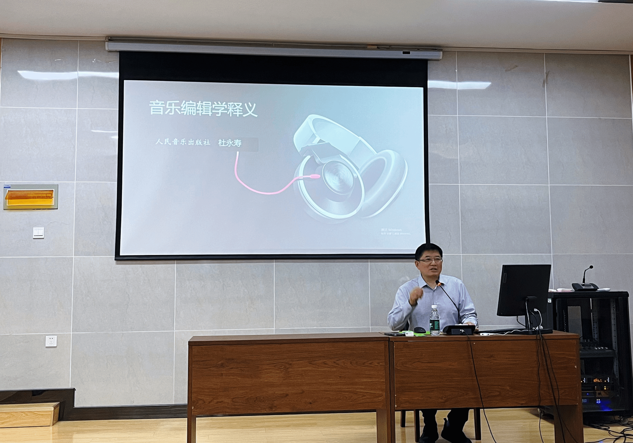 讲座伊始,杜永寿首先对音乐编辑学的定义和范畴进行了概述,明确了音乐编辑学是研究音乐编辑活动的规律和方法的学科。接着,他结合具体的著作、教材、乐谱等图文编辑工作案例,分别对文字编辑、曲谱编辑、音乐教材编辑和音像制品编辑等不同类型的编辑工作展开详细讲解,分析了不同类型编辑工作的特点与要求,指出了编辑过程中需要重视的细节及注意事项。
